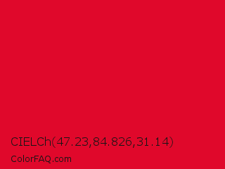 CIELCh 47.23,84.826,31.14 Color is a normal red color and the nearest color is Medium Candy Apple Red #e2062c. Hex code #e0082b and RGB value is rgb(224,8,43). In RGB color space, this color is composed of 88% red, 3% green, 17% blue, In CMYK color space, this color is composed of 0% cyan, 96% magenta, 81% yellow , 12% black , In HSL color space, this color has a hue angle of 350° , 93% saturation and 45% lightness.