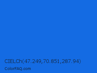 CIELCh 47.249,70.851,287.94 Color is a normal blue color and the nearest color is Bright Navy Blue #1974d2. Hex code #146be3 and RGB value is rgb(20,107,227). In RGB color space, this color is composed of 8% red, 42% green, 89% blue, In CMYK color space, this color is composed of 91% cyan, 53% magenta, 0% yellow , 11% black , In HSL color space, this color has a hue angle of 215° , 84% saturation and 48% lightness.