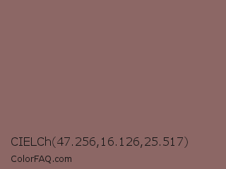 CIELCh 47.256,16.126,25.517 Color is a normal red color and the nearest color is Mauve Taupe #915f6d. Hex code #8c6765 and RGB value is rgb(140,103,101). In RGB color space, this color is composed of 55% red, 40% green, 40% blue, In CMYK color space, this color is composed of 0% cyan, 26% magenta, 28% yellow , 45% black , In HSL color space, this color has a hue angle of 3° , 16% saturation and 47% lightness.
