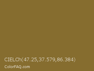 CIELCh 47.25,37.579,86.384 Color is a normal orange color and the nearest color is Spanish Bistre #807532. Hex code #866d2f and RGB value is rgb(134,109,47). In RGB color space, this color is composed of 53% red, 43% green, 18% blue, In CMYK color space, this color is composed of 0% cyan, 19% magenta, 65% yellow , 47% black , In HSL color space, this color has a hue angle of 43° , 48% saturation and 35% lightness.