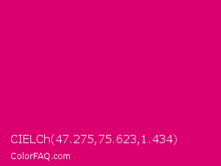 CIELCh 47.275,75.623,1.434 Color is a normal rose color and the nearest color is Red Purple #e40078. Hex code #db0070 and RGB value is rgb(219,0,112). In RGB color space, this color is composed of 86% red, 0% green, 44% blue, In CMYK color space, this color is composed of 0% cyan, 100% magenta, 49% yellow , 14% black , In HSL color space, this color has a hue angle of 329° , 100% saturation and 43% lightness.