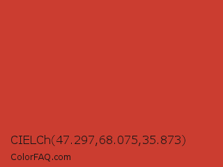 CIELCh 47.297,68.075,35.873 Color is a normal red color and the nearest color is Flush Mahogany #ca3435. Hex code #cb3d30 and RGB value is rgb(203,61,48). In RGB color space, this color is composed of 80% red, 24% green, 19% blue, In CMYK color space, this color is composed of 0% cyan, 70% magenta, 76% yellow , 20% black , In HSL color space, this color has a hue angle of 5° , 62% saturation and 49% lightness.