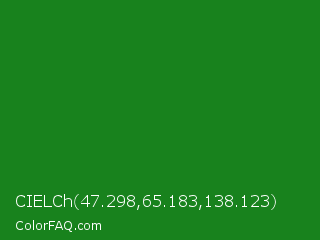CIELCh 47.298,65.183,138.123 Color is a dark green color and the nearest color is Forest Green #228b22. Hex code #18821d and RGB value is rgb(24,130,29). In RGB color space, this color is composed of 9% red, 51% green, 11% blue, In CMYK color space, this color is composed of 82% cyan, 0% magenta, 78% yellow , 49% black , In HSL color space, this color has a hue angle of 123° , 69% saturation and 30% lightness.