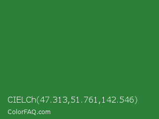 CIELCh 47.313,51.761,142.546 Color is a normal green color and the nearest color is Forest Green #228b22. Hex code #2c8038 and RGB value is rgb(44,128,56). In RGB color space, this color is composed of 17% red, 50% green, 22% blue, In CMYK color space, this color is composed of 66% cyan, 0% magenta, 56% yellow , 50% black , In HSL color space, this color has a hue angle of 129° , 49% saturation and 34% lightness.