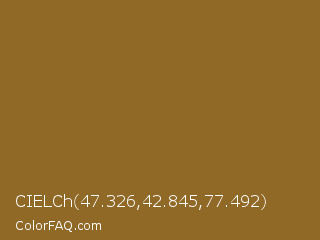 CIELCh 47.326,42.845,77.492 Color is a normal orange color and the nearest color is Kumera #886221. Hex code #916927 and RGB value is rgb(145,105,39). In RGB color space, this color is composed of 57% red, 41% green, 15% blue, In CMYK color space, this color is composed of 0% cyan, 28% magenta, 73% yellow , 43% black , In HSL color space, this color has a hue angle of 37° , 58% saturation and 36% lightness.