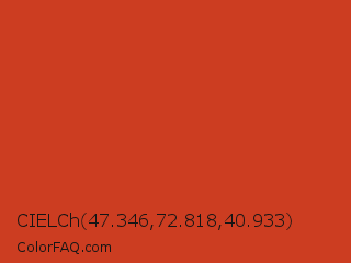 CIELCh 47.346,72.818,40.933 Color is a normal red color and the nearest color is Dark Pastel Red #c23b22. Hex code #cc3d21 and RGB value is rgb(204,61,33). In RGB color space, this color is composed of 80% red, 24% green, 13% blue, In CMYK color space, this color is composed of 0% cyan, 70% magenta, 84% yellow , 20% black , In HSL color space, this color has a hue angle of 10° , 72% saturation and 46% lightness.