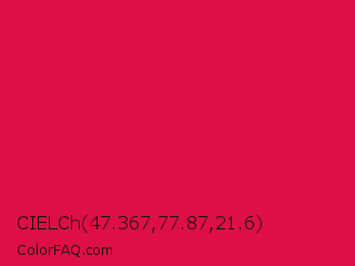 CIELCh 47.367,77.87,21.6 Color is a normal rose color and the nearest color is Crimson #dc143c. Hex code #de0f45 and RGB value is rgb(222,15,69). In RGB color space, this color is composed of 87% red, 6% green, 27% blue, In CMYK color space, this color is composed of 0% cyan, 93% magenta, 69% yellow , 13% black , In HSL color space, this color has a hue angle of 344° , 87% saturation and 46% lightness.