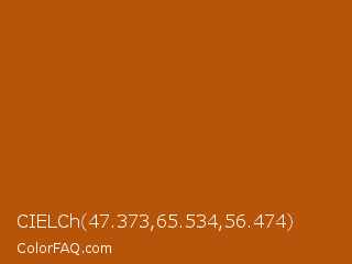 CIELCh 47.373,65.534,56.474 Color is a normal orange color and the nearest color is Fiery Orange #b35213. Hex code #b65409 and RGB value is rgb(182,84,9). In RGB color space, this color is composed of 71% red, 33% green, 4% blue, In CMYK color space, this color is composed of 0% cyan, 54% magenta, 95% yellow , 29% black , In HSL color space, this color has a hue angle of 26° , 91% saturation and 37% lightness.