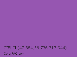 CIELCh 47.384,56.736,317.944 Color is a normal purple color and the nearest color is Purple Plum #9c51b6. Hex code #9656b1 and RGB value is rgb(150,86,177). In RGB color space, this color is composed of 59% red, 34% green, 69% blue, In CMYK color space, this color is composed of 15% cyan, 51% magenta, 0% yellow , 31% black , In HSL color space, this color has a hue angle of 282° , 37% saturation and 52% lightness.