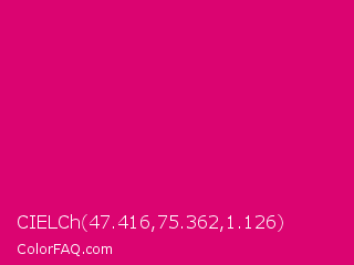 CIELCh 47.416,75.362,1.126 Color is a normal rose color and the nearest color is Red Purple #e40078. Hex code #db0471 and RGB value is rgb(219,4,113). In RGB color space, this color is composed of 86% red, 2% green, 44% blue, In CMYK color space, this color is composed of 0% cyan, 98% magenta, 48% yellow , 14% black , In HSL color space, this color has a hue angle of 330° , 96% saturation and 44% lightness.