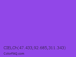 CIELCh 47.433,92.685,311.343 Color is a normal violet color and the nearest color is Navy Purple #9457eb. Hex code #9147e8 and RGB value is rgb(145,71,232). In RGB color space, this color is composed of 57% red, 28% green, 91% blue, In CMYK color space, this color is composed of 38% cyan, 69% magenta, 0% yellow , 9% black , In HSL color space, this color has a hue angle of 268° , 78% saturation and 59% lightness.