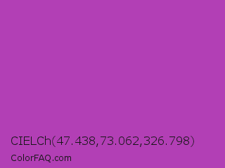 CIELCh 47.438,73.062,326.798 Color is a normal magenta color and the nearest color is Byzantine #bd33a4. Hex code #b23fb5 and RGB value is rgb(178,63,181). In RGB color space, this color is composed of 70% red, 25% green, 71% blue, In CMYK color space, this color is composed of 2% cyan, 65% magenta, 0% yellow , 29% black , In HSL color space, this color has a hue angle of 298° , 48% saturation and 48% lightness.