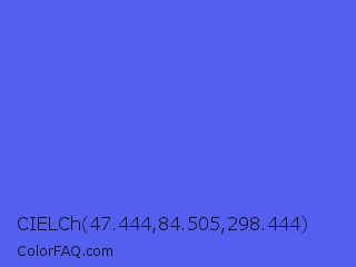 CIELCh 47.444,84.505,298.444 Color is a light blue color and the nearest color is Ultramarine Blue #4166f5. Hex code #545ff0 and RGB value is rgb(84,95,240). In RGB color space, this color is composed of 33% red, 37% green, 94% blue, In CMYK color space, this color is composed of 65% cyan, 60% magenta, 0% yellow , 6% black , In HSL color space, this color has a hue angle of 236° , 84% saturation and 64% lightness.