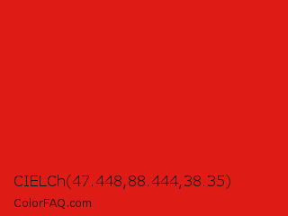 CIELCh 47.448,88.444,38.35 Color is a normal red color and the nearest color is Maximum Red #d92121. Hex code #de1b14 and RGB value is rgb(222,27,20). In RGB color space, this color is composed of 87% red, 11% green, 8% blue, In CMYK color space, this color is composed of 0% cyan, 88% magenta, 91% yellow , 13% black , In HSL color space, this color has a hue angle of 2° , 83% saturation and 47% lightness.