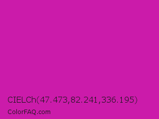 CIELCh 47.473,82.241,336.195 Color is a normal magenta color and the nearest color is Byzantine #bd33a4. Hex code #cb1baa and RGB value is rgb(203,27,170). In RGB color space, this color is composed of 80% red, 11% green, 67% blue, In CMYK color space, this color is composed of 0% cyan, 87% magenta, 16% yellow , 20% black , In HSL color space, this color has a hue angle of 311° , 77% saturation and 45% lightness.