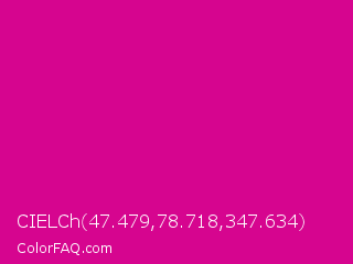 CIELCh 47.479,78.718,347.634 Color is a normal magenta color and the nearest color is Red Violet #c71585. Hex code #d6058f and RGB value is rgb(214,5,143). In RGB color space, this color is composed of 84% red, 2% green, 56% blue, In CMYK color space, this color is composed of 0% cyan, 98% magenta, 33% yellow , 16% black , In HSL color space, this color has a hue angle of 320° , 95% saturation and 43% lightness.