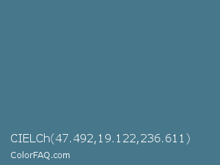 CIELCh 47.492,19.122,236.611 Color is a normal blue color and the nearest color is Bismark #497183. Hex code #47778b and RGB value is rgb(71,119,139). In RGB color space, this color is composed of 28% red, 47% green, 55% blue, In CMYK color space, this color is composed of 49% cyan, 14% magenta, 0% yellow , 45% black , In HSL color space, this color has a hue angle of 198° , 32% saturation and 41% lightness.