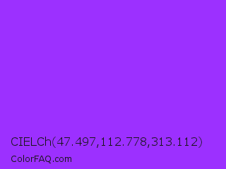 CIELCh 47.497,112.778,313.112 Color is a normal purple color and the nearest color is Veronica #a020f0. Hex code #9c30ff and RGB value is rgb(156,48,255). In RGB color space, this color is composed of 61% red, 19% green, 100% blue, In CMYK color space, this color is composed of 39% cyan, 81% magenta, 0% yellow , 0% black , In HSL color space, this color has a hue angle of 271° , 100% saturation and 59% lightness.