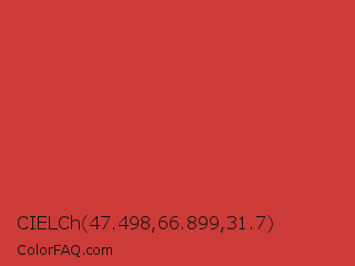 CIELCh 47.498,66.899,31.7 Color is a normal red color and the nearest color is Flush Mahogany #ca3435. Hex code #cd3b39 and RGB value is rgb(205,59,57). In RGB color space, this color is composed of 80% red, 23% green, 22% blue, In CMYK color space, this color is composed of 0% cyan, 71% magenta, 72% yellow , 20% black , In HSL color space, this color has a hue angle of 1° , 60% saturation and 51% lightness.