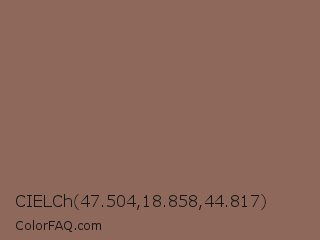 CIELCh 47.504,18.858,44.817 Color is a normal color and the nearest color is Beaver Crayola #926f5b. Hex code #8e685b and RGB value is rgb(142,104,91). In RGB color space, this color is composed of 56% red, 41% green, 36% blue, In CMYK color space, this color is composed of 0% cyan, 27% magenta, 36% yellow , 44% black , In HSL color space, this color has a hue angle of 15° , 22% saturation and 46% lightness.