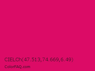 CIELCh 47.513,74.669,6.49 Color is a normal rose color and the nearest color is Ruby #e0115f. Hex code #dc0b66 and RGB value is rgb(220,11,102). In RGB color space, this color is composed of 86% red, 4% green, 40% blue, In CMYK color space, this color is composed of 0% cyan, 95% magenta, 54% yellow , 14% black , In HSL color space, this color has a hue angle of 334° , 90% saturation and 45% lightness.