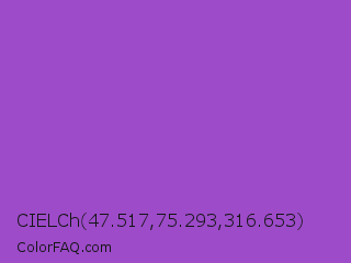 CIELCh 47.517,75.293,316.653 Color is a normal purple color and the nearest color is Deep Lilac #9955bb. Hex code #9d4bc9 and RGB value is rgb(157,75,201). In RGB color space, this color is composed of 62% red, 29% green, 79% blue, In CMYK color space, this color is composed of 22% cyan, 63% magenta, 0% yellow , 21% black , In HSL color space, this color has a hue angle of 279° , 54% saturation and 54% lightness.
