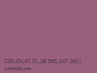 CIELCh 47.51,28.585,347.261 Color is a normal rose color and the nearest color is Antique Fuchsia #915c83. Hex code #995f7c and RGB value is rgb(153,95,124). In RGB color space, this color is composed of 60% red, 37% green, 49% blue, In CMYK color space, this color is composed of 0% cyan, 38% magenta, 19% yellow , 40% black , In HSL color space, this color has a hue angle of 330° , 23% saturation and 49% lightness.