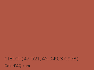 CIELCh 47.521,45.049,37.958 Color is a normal red color and the nearest color is Brown Rust #af593e. Hex code #b15644 and RGB value is rgb(177,86,68). In RGB color space, this color is composed of 69% red, 34% green, 27% blue, In CMYK color space, this color is composed of 0% cyan, 51% magenta, 62% yellow , 31% black , In HSL color space, this color has a hue angle of 10° , 44% saturation and 48% lightness.