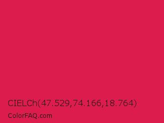 CIELCh 47.529,74.166,18.764 Color is a normal red color and the nearest color is Spanish Crimson #e51a4c. Hex code #db1c4d and RGB value is rgb(219,28,77). In RGB color space, this color is composed of 86% red, 11% green, 30% blue, In CMYK color space, this color is composed of 0% cyan, 87% magenta, 65% yellow , 14% black , In HSL color space, this color has a hue angle of 345° , 77% saturation and 48% lightness.
