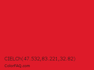 CIELCh 47.532,83.221,32.82 Color is a normal red color and the nearest color is Maximum Red #d92121. Hex code #de1a29 and RGB value is rgb(222,26,41). In RGB color space, this color is composed of 87% red, 10% green, 16% blue, In CMYK color space, this color is composed of 0% cyan, 88% magenta, 82% yellow , 13% black , In HSL color space, this color has a hue angle of 355° , 79% saturation and 49% lightness.