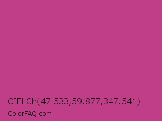 CIELCh 47.533,59.877,347.541 Color is a normal magenta color and the nearest color is Smitten #c84186. Hex code #c03e88 and RGB value is rgb(192,62,136). In RGB color space, this color is composed of 75% red, 24% green, 53% blue, In CMYK color space, this color is composed of 0% cyan, 68% magenta, 29% yellow , 25% black , In HSL color space, this color has a hue angle of 326° , 51% saturation and 50% lightness.