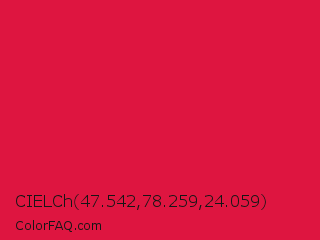 CIELCh 47.542,78.259,24.059 Color is a normal red color and the nearest color is Crimson #dc143c. Hex code #de1540 and RGB value is rgb(222,21,64). In RGB color space, this color is composed of 87% red, 8% green, 25% blue, In CMYK color space, this color is composed of 0% cyan, 91% magenta, 71% yellow , 13% black , In HSL color space, this color has a hue angle of 347° , 83% saturation and 48% lightness.