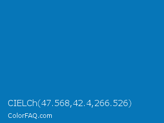 CIELCh 47.568,42.4,266.526 Color is a normal blue color and the nearest color is Star Command Blue #007bb8. Hex code #0676b8 and RGB value is rgb(6,118,184). In RGB color space, this color is composed of 2% red, 46% green, 72% blue, In CMYK color space, this color is composed of 97% cyan, 36% magenta, 0% yellow , 28% black , In HSL color space, this color has a hue angle of 202° , 94% saturation and 37% lightness.