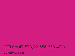 CIELCh 47.573,72.656,353.479 Color is a normal magenta color and the nearest color is Vivid Cerise #da1d81. Hex code #d41d81 and RGB value is rgb(212,29,129). In RGB color space, this color is composed of 83% red, 11% green, 51% blue, In CMYK color space, this color is composed of 0% cyan, 86% magenta, 39% yellow , 17% black , In HSL color space, this color has a hue angle of 327° , 76% saturation and 47% lightness.