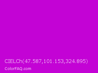 CIELCh 47.587,101.153,324.895 Color is a normal magenta color and the nearest color is Deep Magenta #cc00cc. Hex code #c303d5 and RGB value is rgb(195,3,213). In RGB color space, this color is composed of 76% red, 1% green, 84% blue, In CMYK color space, this color is composed of 8% cyan, 99% magenta, 0% yellow , 16% black , In HSL color space, this color has a hue angle of 295° , 97% saturation and 42% lightness.