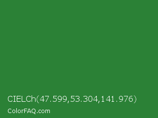 CIELCh 47.599,53.304,141.976 Color is a normal green color and the nearest color is Forest Green #228b22. Hex code #2b8136 and RGB value is rgb(43,129,54). In RGB color space, this color is composed of 17% red, 51% green, 21% blue, In CMYK color space, this color is composed of 67% cyan, 0% magenta, 58% yellow , 49% black , In HSL color space, this color has a hue angle of 128° , 50% saturation and 34% lightness.