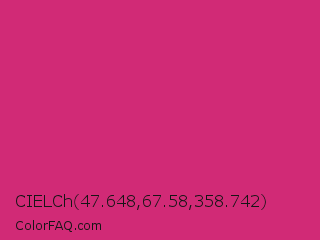 CIELCh 47.648,67.58,358.742 Color is a normal rose color and the nearest color is Telemagenta #cf3476. Hex code #d12a76 and RGB value is rgb(209,42,118). In RGB color space, this color is composed of 82% red, 16% green, 46% blue, In CMYK color space, this color is composed of 0% cyan, 80% magenta, 44% yellow , 18% black , In HSL color space, this color has a hue angle of 333° , 67% saturation and 49% lightness.