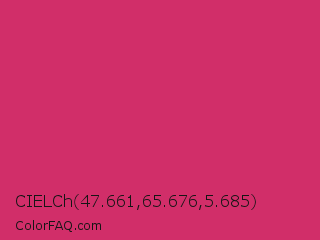 CIELCh 47.661,65.676,5.685 Color is a normal rose color and the nearest color is Telemagenta #cf3476. Hex code #d12e69 and RGB value is rgb(209,46,105). In RGB color space, this color is composed of 82% red, 18% green, 41% blue, In CMYK color space, this color is composed of 0% cyan, 78% magenta, 50% yellow , 18% black , In HSL color space, this color has a hue angle of 338° , 64% saturation and 50% lightness.