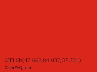 CIELCh 47.662,84.037,37.731 Color is a normal red color and the nearest color is Maximum Red #d92121. Hex code #db261c and RGB value is rgb(219,38,28). In RGB color space, this color is composed of 86% red, 15% green, 11% blue, In CMYK color space, this color is composed of 0% cyan, 83% magenta, 87% yellow , 14% black , In HSL color space, this color has a hue angle of 3° , 77% saturation and 48% lightness.