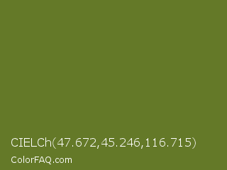 CIELCh 47.672,45.246,116.715 Color is a normal lime color and the nearest color is Fern Frond #657220. Hex code #647928 and RGB value is rgb(100,121,40). In RGB color space, this color is composed of 39% red, 47% green, 16% blue, In CMYK color space, this color is composed of 17% cyan, 0% magenta, 67% yellow , 53% black , In HSL color space, this color has a hue angle of 76° , 50% saturation and 32% lightness.