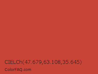 CIELCh 47.679,63.108,35.645 Color is a normal red color and the nearest color is Mojo #c04737. Hex code #c74436 and RGB value is rgb(199,68,54). In RGB color space, this color is composed of 78% red, 27% green, 21% blue, In CMYK color space, this color is composed of 0% cyan, 66% magenta, 73% yellow , 22% black , In HSL color space, this color has a hue angle of 6° , 57% saturation and 50% lightness.
