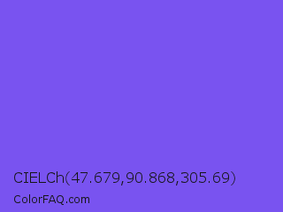 CIELCh 47.679,90.868,305.69 Color is a light indigo color and the nearest color is Medium Slate Blue #7b68ee. Hex code #7953f0 and RGB value is rgb(121,83,240). In RGB color space, this color is composed of 47% red, 33% green, 94% blue, In CMYK color space, this color is composed of 50% cyan, 65% magenta, 0% yellow , 6% black , In HSL color space, this color has a hue angle of 255° , 84% saturation and 63% lightness.