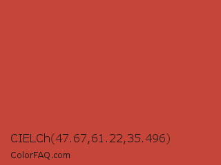 CIELCh 47.67,61.22,35.496 Color is a normal red color and the nearest color is Mojo #c04737. Hex code #c54638 and RGB value is rgb(197,70,56). In RGB color space, this color is composed of 77% red, 27% green, 22% blue, In CMYK color space, this color is composed of 0% cyan, 64% magenta, 72% yellow , 23% black , In HSL color space, this color has a hue angle of 6° , 56% saturation and 50% lightness.