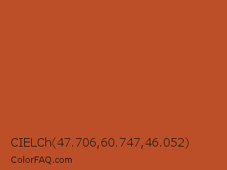 CIELCh 47.706,60.747,46.052 Color is a normal orange color and the nearest color is Tuscany #bd5e2e. Hex code #bd4f28 and RGB value is rgb(189,79,40). In RGB color space, this color is composed of 74% red, 31% green, 16% blue, In CMYK color space, this color is composed of 0% cyan, 58% magenta, 79% yellow , 26% black , In HSL color space, this color has a hue angle of 16° , 65% saturation and 45% lightness.