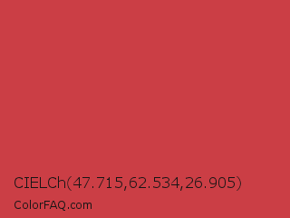 CIELCh 47.715,62.534,26.905 Color is a normal red color and the nearest color is English Vermillion #cc474b. Hex code #cb3e45 and RGB value is rgb(203,62,69). In RGB color space, this color is composed of 80% red, 24% green, 27% blue, In CMYK color space, this color is composed of 0% cyan, 69% magenta, 66% yellow , 20% black , In HSL color space, this color has a hue angle of 357° , 58% saturation and 52% lightness.
