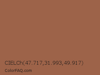 CIELCh 47.717,31.993,49.917 Color is a normal orange color and the nearest color is Cape Palliser #a26645. Hex code #9d6349 and RGB value is rgb(157,99,73). In RGB color space, this color is composed of 62% red, 39% green, 29% blue, In CMYK color space, this color is composed of 0% cyan, 37% magenta, 54% yellow , 38% black , In HSL color space, this color has a hue angle of 19° , 37% saturation and 45% lightness.
