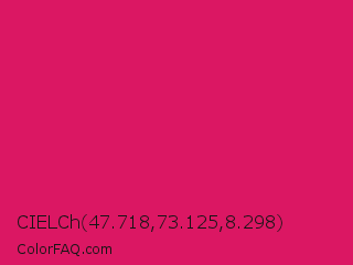 CIELCh 47.718,73.125,8.298 Color is a normal rose color and the nearest color is Dogwood Rose #d71868. Hex code #db1763 and RGB value is rgb(219,23,99). In RGB color space, this color is composed of 86% red, 9% green, 39% blue, In CMYK color space, this color is composed of 0% cyan, 89% magenta, 55% yellow , 14% black , In HSL color space, this color has a hue angle of 337° , 81% saturation and 47% lightness.