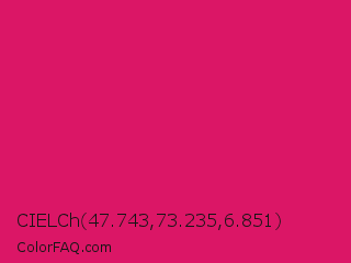 CIELCh 47.743,73.235,6.851 Color is a normal rose color and the nearest color is Dogwood Rose #d71868. Hex code #db1666 and RGB value is rgb(219,22,102). In RGB color space, this color is composed of 86% red, 9% green, 40% blue, In CMYK color space, this color is composed of 0% cyan, 90% magenta, 53% yellow , 14% black , In HSL color space, this color has a hue angle of 336° , 82% saturation and 47% lightness.
