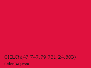 CIELCh 47.747,79.731,24.803 Color is a normal red color and the nearest color is Crimson #dc143c. Hex code #e0113e and RGB value is rgb(224,17,62). In RGB color space, this color is composed of 88% red, 7% green, 24% blue, In CMYK color space, this color is composed of 0% cyan, 92% magenta, 72% yellow , 12% black , In HSL color space, this color has a hue angle of 347° , 86% saturation and 47% lightness.