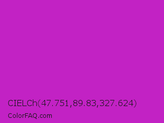 CIELCh 47.751,89.83,327.624 Color is a normal magenta color and the nearest color is Steel Pink #cc33cc. Hex code #c222c4 and RGB value is rgb(194,34,196). In RGB color space, this color is composed of 76% red, 13% green, 77% blue, In CMYK color space, this color is composed of 1% cyan, 83% magenta, 0% yellow , 23% black , In HSL color space, this color has a hue angle of 299° , 70% saturation and 45% lightness.